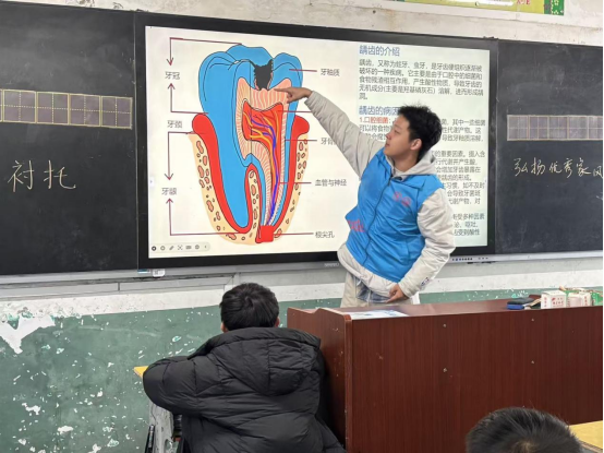 活动现场暖意融融、趣味盎然。志愿者们以动画短片、趣味PPT与模型演示相结合的方式,用生动易懂、贴近儿童的语言,系统讲解牙齿结构功能、龋齿形成原因、换牙期防护要点及窝沟封闭等知识。“原来牙齿里面藏着这么多小秘密!”一名学生听完讲解后兴奋地说。