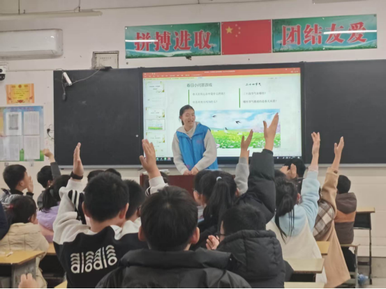 活动在轻松的“春日小问答”中拉开序幕。志愿者们通过生动讲解,带领同学们探秘“惊蛰”与“春分”:从“春雷惊百虫”的传说到“桃始华、玄鸟至”的物候,从“吃梨”“竖蛋”的习俗到昼夜平分的科学原理,让孩子们在互动问答中感受传统文化的魅力。针对春季传染病高发期,志愿者们还开设“春季小讲堂”,用通俗语言和形象图示讲解流感、诺如病毒的预防方法,通过示范“洗手七步法”“咳嗽礼仪”等健康知识,引导孩子们从“被动防护”转向“主动管理”,争当班级“健康小卫士”。