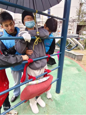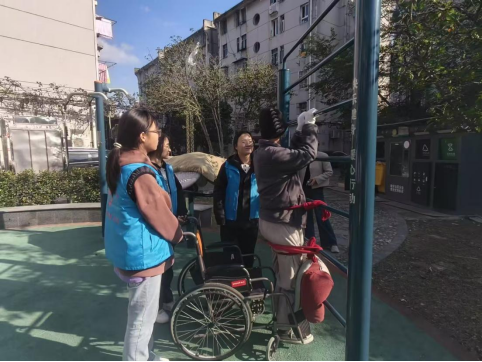 在本月连续开展的数次服务中,星火志愿服务队始终延续“按需帮扶、精准陪伴”的初心,也不断积累经验、优化服务细节。面对有康复需求的老人,志愿者提前学习基础康复知识,耐心协助调整器材高度与力度。在一次陪伴中,志愿者注意到腿部肌力较弱的张爷爷想借助肋木架做拉伸,便轻巧地取来随身备好的红绒布带,一端系在老人腰侧,一端稳稳握在手中,同时撑着伞为他挡去凉风,嘴里轻声数着节奏:“爷爷,咱们慢慢抬,1、2、3……”蓝马甲的身影、红布带的暖意、伞沿漏下的细碎光斑,共同构成社区里最动人的画面。